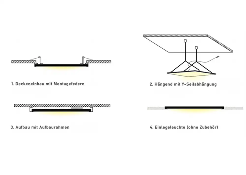 The LED ceiling grid luminaire is quick and easy to install and offers a wide range of installation options. It can be installed as a recessed ceiling luminaire with mounting springs, as a surface-mounted luminaire with an optional aluminium mounting frame (white, RAL 9016), as an insert luminaire without additional accessories, or as a pendant luminaire using a Y-cable suspension system.