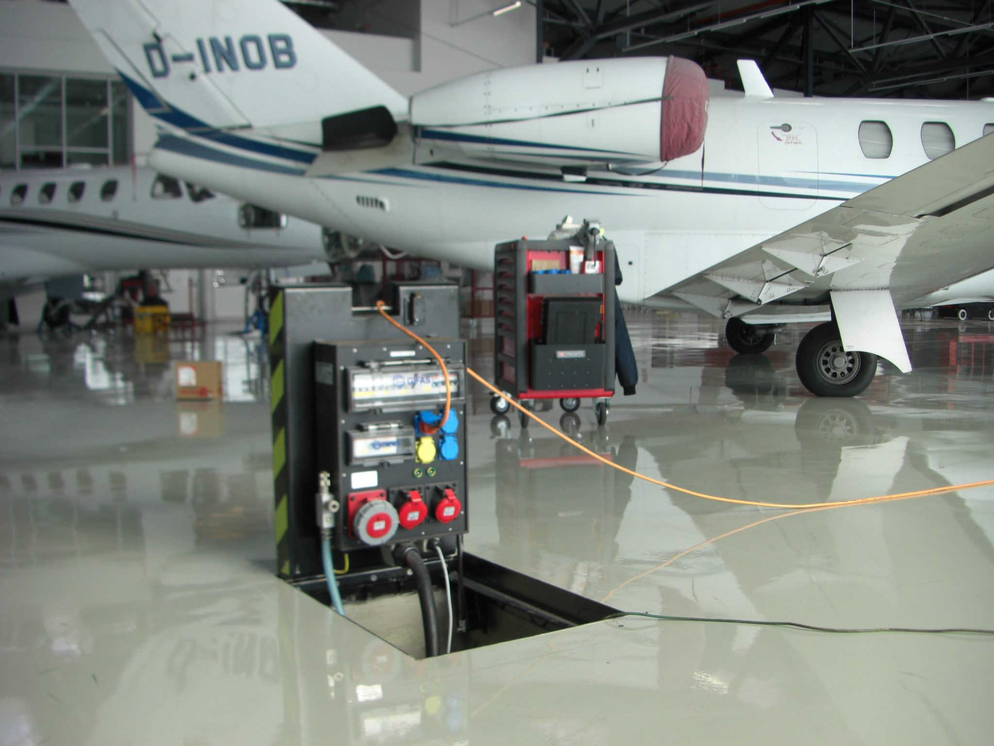 Unser Kunde benötigte für die Wartung und den Reparaturdienst von Flugzeugen hierzu eine massive Unterflurkonstruktion, die bis 125t belastbar ist. Zudem sollten alle Anschlüsse frei bedienbar und auf Wunsch im Verteiler verschließbar sein. Der Verteiler ist optisch unauffällig in die Gebäudestruktur zu integrieren.