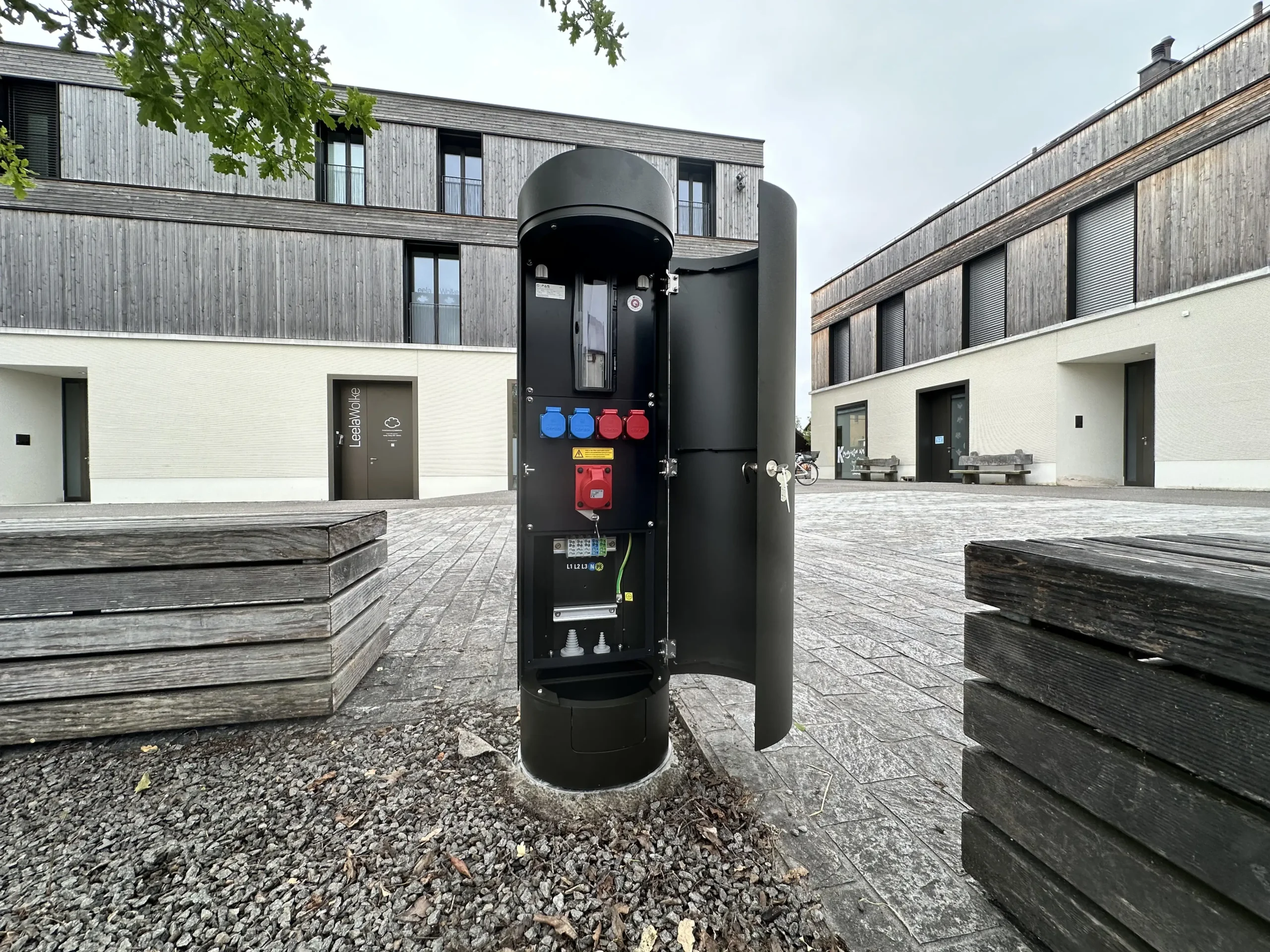 Im innerstädtischen Bereich eines Wohngebiets wurde eine zentrale Lösung zur Stromversorgung im öffentlichen Raum gesucht. Die Anforderung: eine dauerhaft verfügbare, leicht zugängliche Energiequelle, die gleichzeitig hohen Schutz vor Vandalismus bietet und sich unauffällig in das städtebauliche Umfeld integriert. Eine herkömmliche Stromverteilung schied aufgrund gestalterischer und sicherheitstechnischer Anforderungen aus.