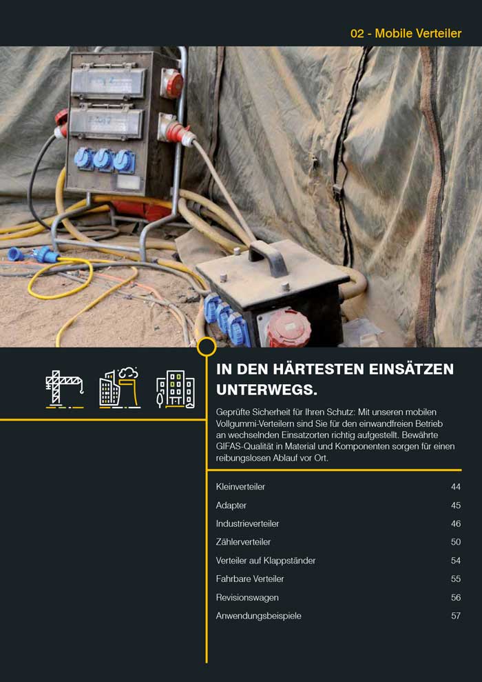 Ein mobiler Stromverteiler sorgt für den passenden Anschluss auch ohne aufwendige Installation. So ist Strom an wechselnden Einsatzorten stets zuverlässig verfügbar. Die hochwertigen Verteiler von GIFAS sind besonders robust konstruiert und lassen sich auch unter widrigsten Bedingungen problemlos einsetzen. Kernstück der mobilen Verteiler ist ein stabiles Vollgummigehäuse. Ein bewährtes Konstruktionsmerkmal, das unsere mobilen Verteiler bereits seit langem auszeichnet. Die stabilen Vollgummi-Verteiler können darüber hinaus individuell nach Kundenwunsch bestückt werden. Sie lassen sich vielfältig in Industrie, Gewerbe und Handwerk einsetzen und sind in zahlreichen Ausführungen erhältlich: